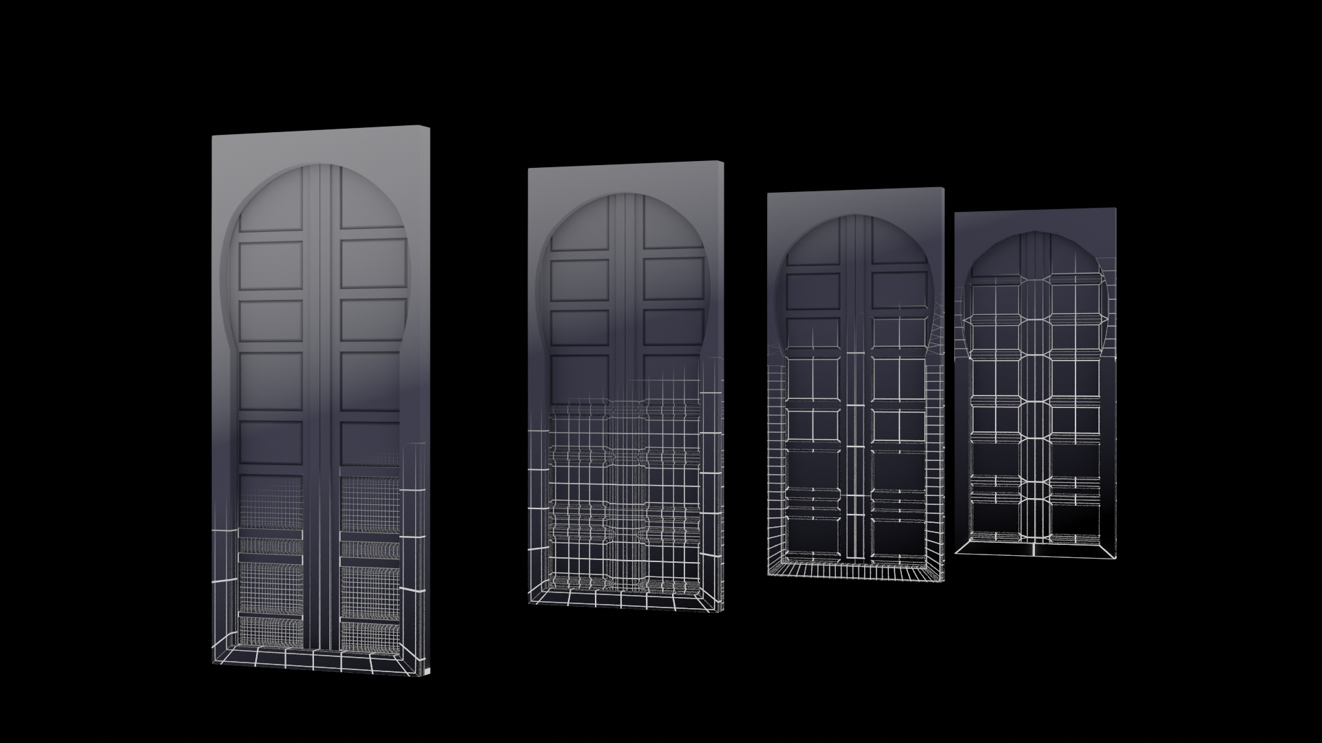 La première étape de notre voyage numérique est la modélisation 3D, où nous créons une représentation tridimensionnelle de l’abattoir en hard surface à laquelle sont appliquées des imperfections anthropiques grâce à la sculpture numérique. La retopologie assure l’optimisation du maillage et la réduction topologique permet un équilibre entre la précision polygonale et l’efficacité de la performance, garantissant un modèle 3D détaillé et manipulable. La création de différents niveaux de détails : ‘Level of Details’ (LOD), sur lesquels seront ensuite appliquées des cartes de normals issues des modèles haute définition, est une procédure visant à adapter la complexité du modèle en fonction de la proximité ou de l’éloignement de l’observateur, optimisant ainsi la performance sans sacrifier la qualité visuelle.